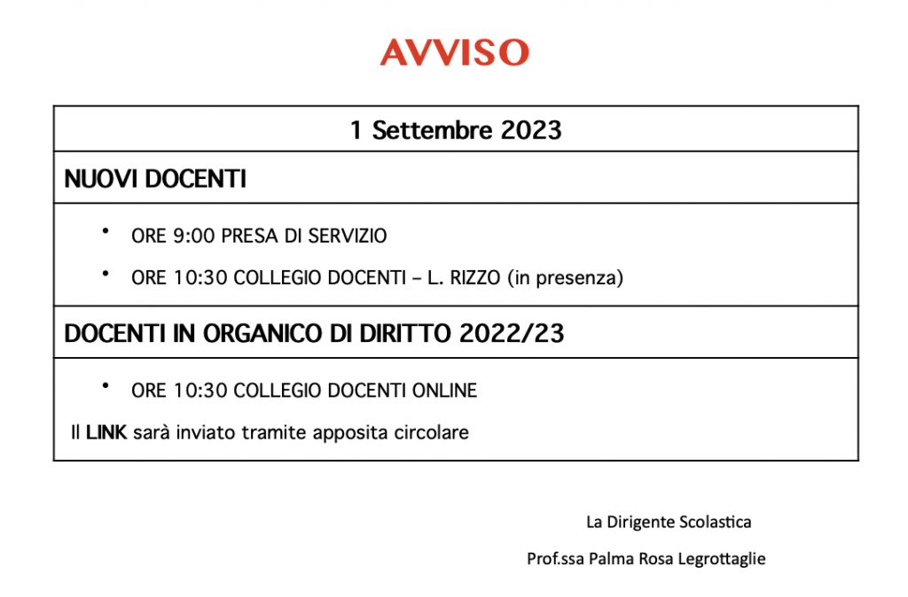 Bacheca news docenti e ATA Sezione dedicata ai docenti e al personale ATA; qui è possibile trovare tutte le news e gli aggiornamenti relativi all’anno scolastico in corso PIANO ANNUALE DELLE ATTIVITÀ A.S. 2023_24 Visualizza e scarica qui il pdf Circolare-n-35-avvio-corso-formazione-PNRR-DM-65_23-Lingua-inglese CIRCOLARE-N.-22-Rettifica-selezione-docenti-_corso-lingue-linea-B-1 Circolare-n.-24-FRUIZIONE-AULA-SNOEZELEN REGOLAMENTO-AULA-SNOEZELEN RICHIESTA-USO-AULA Circolare n.22: Rettifica-selezione-docenti-corso-lingue-linea-B Pubblicazione graduatorie di istituto I – II – III fascia, scuola dell’Infanzia, Primaria e Secondaria di Primo Grado INFORMATIVA SELEZIONE PERSONALE DOCENTE BENEFICIARIO PERCORSO DI FORMAZIONE ANNUALE PER IL POTENZIAMENTO DELLE COMPETENZE LINGUISTICHE DEI DOCENTI Disposizioni operative D. Lgs 81/08 testo Unico sulla sicurezza. AVVISO DI SELEZIONE INTERNA PER IL CONFERIMENTO DI NUMERO 6 (SEI) INCARICHI PER LACOSTITUZIONE DELLA “COMUNITA’ DI PRATICHE PER L’APPRENDIMENTO” Allegato A Allegato B Allegato C NORME ED ORGANIZZAZIONE DADA – QUADRO ORARIO SCOLASTICO PROVVISORIO E DEFINITIVO CON RELATIVI INGRESSI ED USCITE Planimetria Plesso Luigi Rizzo Pubblicazione graduatorie definitive di Istituto terza fascia del Personale ATA – D.M. n. 89 del 21/05/2024. GRADUATORIA-DEFINITIVA-A.A.-MEIC8AA00E-12-09-2024.Graduatoria-Definitiva GRADUATORIA-DEFINITIVA-C.S.-MEIC8AA00E-12-09-2024.Graduatoria-Definitiva GRADUATORIA-DEFINITIVA-O.S.-MEIC8AA00E-12-09-2024.Graduatoria-Definitiva Circolare n.4: commissioni dei lavoro Circolare n.3: piattaforma G.Suite (e allegato sulle procedure del primo accesso) Circolare n.2: comunicazione informazioni inerenti l’avvio dell’anno scolastico Circolare n.1: Impegni di Settembre Convocazione COLLEGIO DOCENTI del 3 Settembre 2024 Decreto pubblicazione graduatorie PROVVISORIE di Circolo e d’Istituto di terza fascia del perso- nale ATA. – D.M. n. 89 del 21/05/2024 GRADUATORIA PROVVISORIA AA MEIC8AA00E 16082024 GRADUATORIA PROVVISORIA CS MEIC8AA00E 16082024 GRADUATORIA_PROVVISORIA OS MEIC8AA00E 16082024 Concorsi a soli titoli personale ATA anno scolastico 2023/24: Pubblicazione graduatorie provinciali provvisorie a.s. 2024/25. Graduatoria provinciale permanente provvisoria privacy personale ATA a.s 2023-24 Modello Reclamo_24Mesi_Ata_2023-24 Ultimi incontri corso Canva Circolare n.307: Corso animatore Circolare n.304: Calendario Esami di stato 1° ciclo di istruzione Circolare 277: Selezione personale interno per formazione sulla didattica digitale Pubblicazione graduatorie definitive uniche docenti Convegno CESP mercoledì 29 aprile 2024 – CATANIA CESP CT 29-4-24 autonomia differenziata Pubblicazione graduatorie uniche personale DOCENTE a seguito dimensionamento rete scolastica I° GRADO – AB25 INGLESE I° GRADO – A001 ARTE I° GRADO – A022 LETTERE I° GRADO – A028 MATEMATICA I° GRADO – A030 MUSICA I° GRADO – A049 MOTORIA I° GRADO – A060 TECNOLOGIA I° GRADO – AA25 FRANCESE I° GRADO – AC25 LINGUA STRANIERA SPAGNOLO I° GRADO SOSTEGNO INFANZIA COMUNE INFANZIA SOSTEGNO PRIMARIA COMUNE PRIMARIA LINGUA INGLESE PRIMARIA SOSTEGNO Pubblicazione graduatorie provvisorie uniche docenti Pubblicazione-graduatorie-uniche-personale-DOCENTE-a-seguito-dimensionamento-rete-scolastica I°-GRADO-AB25-INGLESE I°-GRADO-A001-ARTE I°-GRADO-A022-LETTERE I°-GRADO-A028-MATEMATICA I°-GRADO-A030-MUSICA I°-GRADO-A049-MOTORIA I°-GRADO-A060-TECNOLOGIA I°-GRADO-AA25-FRANCESE I°-GRADO-AC25-LINGUA-STRANIERA-SPAGNOLO I°-GRADO-SOSTEGNO INFANZIA-COMUNE INFANZIA-SOSTEGNO PRIMARIA-COMUNE PRIMARIA-LINGUA-INGLESE PRIMARIA-SOSTEGNO Pubblicazione graduatorie uniche ATA Pubblicazione graduatorie uniche personale ATA a seguito dimensionamento rete scolastica. GRADUATORIA-UNICA-DI-ISTITUTO-A-SEGUITO-DIMENSIONAMENTO-A.A GRADUATORIA-UNICA-DI-ISTITUTO-A-SEGUITO-DIMENSIONAMENTO-C.S. Circolare-n.-200-Graduatorie-distituto-docenti-e-ATA Dichiarazione-di-variazione-non-variazione-23-24 dichiarazione-personale-esigenze-di-famiglia-2023-24 SCHEDA-INDIVIDUAZIONE-DOCENTI-SOPRANNUMERARI 1 corrispondenza profili professionale 2-ALLEGATO D scuola primaria 3 ALLEGATO D secondaria 1 4 ALLEGATO D ata 2 5 DICHIARAZIONE PUNTEGGIO AGGIUNTIVO 1 6 ALLEGATO E ata servizio continuativo 1 7 ALLEGATO F dichiarazione servizio continuativo 8 ALLEGATO F punteggio aggiuntivo ata 1 9 DICHIARAZIONI INSEGNANTI RELIGIONE CATTOLICA 2024_25 1 10 ALLEGATO G Dichiarazione docenti beneficiari deroghe 2 11-ALLEGATO-G-ATA-autodichiarazione-ex-art-1-co-9-OM-1 Circolare n.199: Trasmissione modello per scelta nuova titolarità A.-S. 2024-2025 Modulo-scelta-scuole-ATA Circolare n. 197 Mobilità a.s. 2024-2025 Accordo-integrativo-CCNI-2022_21_2_2024 m_pi.AOOGABMI.Registro-DecretiR.0000030.23-02-2024 m_pi.AOOGABMI.Registro-DecretiR.0000031.23-02-2024 Sciopero 8 Marzo 2024 – Manifesto – Proclamazione – Documento FLC CGIL Circolare n.182: Assemblea Sindacale FLG-CGIL Circolare n.159: Assemblea sindacale in streaming USB-SCUOLA 1 febbraio 2024 Circolare n.149: Corso formazione PRIVACY 30 Gennaio Circolare n.146: comunicazione nuovo indirizzo mail @scuola.istruzione.it Circolare n.143: Corso di formazione “Laboratori didattici e spunti operativi” Circolare n. 138: Convocazione Consigli di Classe del mese di gennaio Circolare n:136 Consigli di classe gennaio 2024 classi III Circolare n 110: Segnalazione dispersiome scolastica Modalità di segnalazione degli alunni in situazione di dispersione scolastica Scheda rilevazione assenze Circolare n.91: Convocazione riunione per dipartimenti Progetto UNICEF-MIM: “SCUOLA AMICA DI BAMBINI, DELLE BAMBINE E DEGLI ADOLESCENTI” Seminario contrasto antisemitismo PROGRAMMA SEMINARIO Circolare n.89: Indizione Assemblea Sindacale in data 29.11.23 GILDA GILDA MESSINA ASSEMBLEA SINDACALE Territoriale presso Maiorana Milazzo NOVEMBRE 29.pdf Seminario “Innovare la didattica con iPAD” Circolare n.68: Comunicazione uso e manutenzione strument